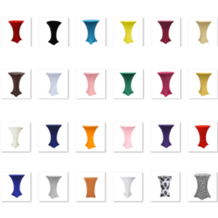 Available in multiple colors, our durable and stylish spandex table covers fit snugly on standard cocktail tables, creating a clean and professional appearance for décor setups, lounge areas, bars, and high-top seating. π
